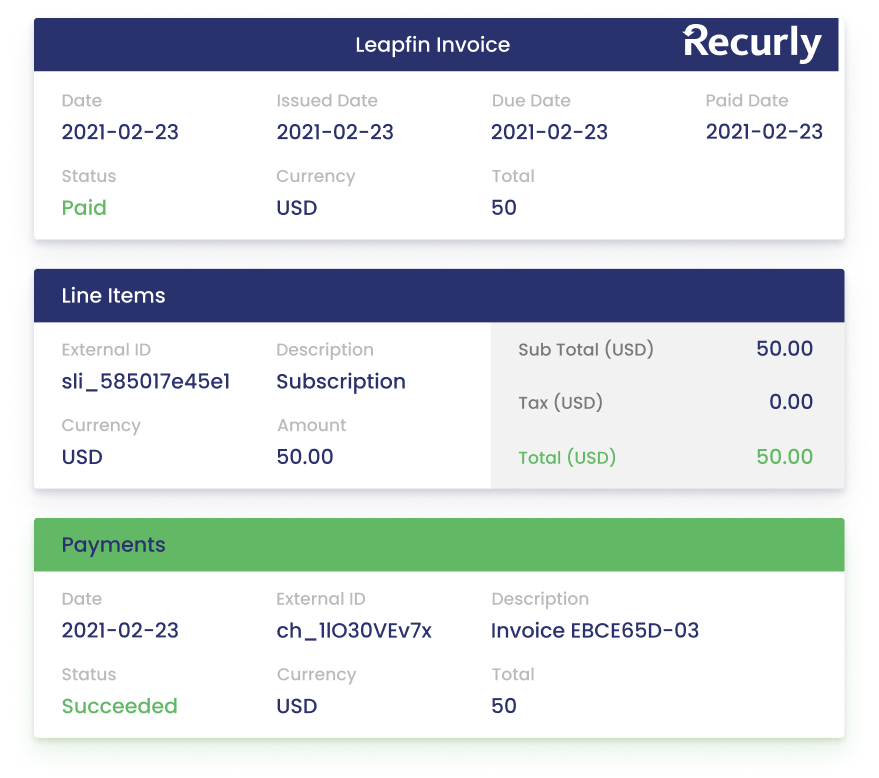 Users can use Leapfin data linking to trace ERP general ledger entries to the Recurly reports and related transaction activities in other systems (order management, billing, etc.).